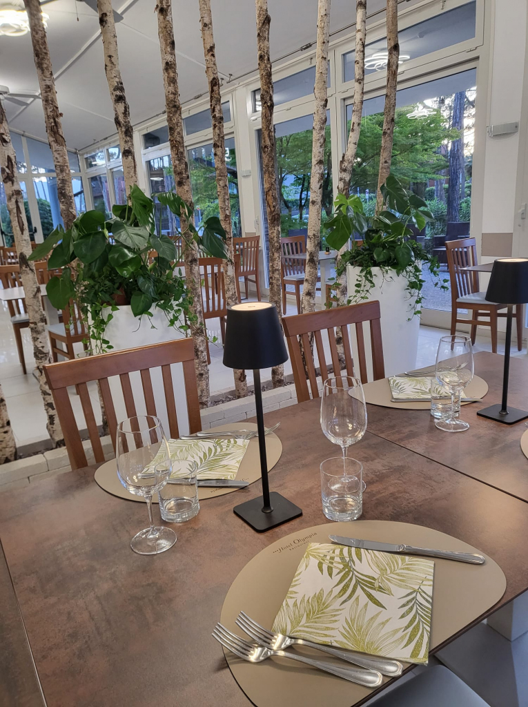Un’ampia vetrata fa da cornice alla spaziosa e luminosa sala ristorante. Tutti i tavoli si affacciano sul tranquillo giardino che circonda l’Hotel Olympia.